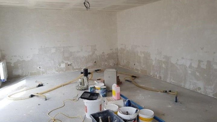 Na fotografiích můžete vidět, jak stavba vypadala při zahájení, kdy byla silně zasažena vlhkostí. Po 14 dnech již byla vlhkost mnohem nižší.